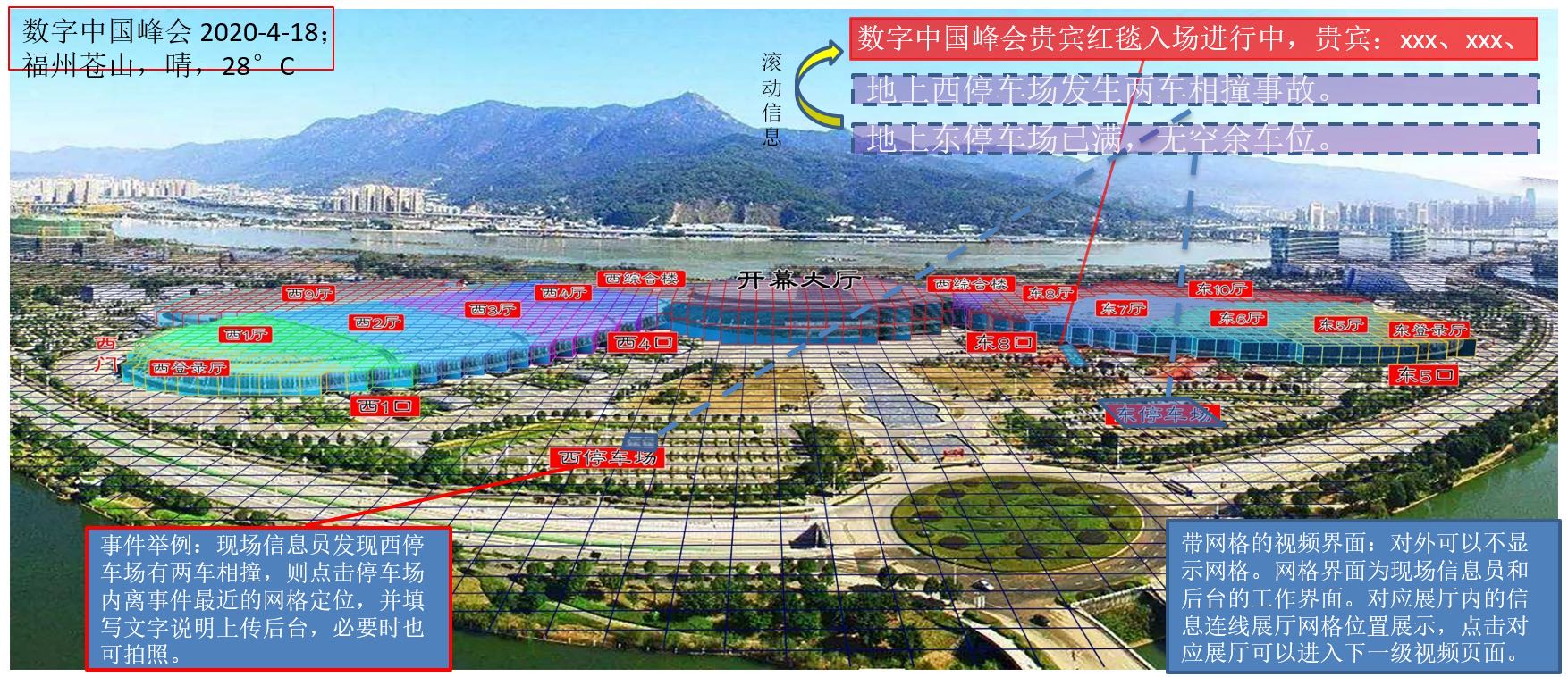 通過給福州倉山海峽會展中心安裝多個高位攝像頭,利用北斗網格編碼和三維網格立體建模技術,實現視頻內容空間感知、快速定位、高效管理、多源數據協同分析能力的視頻網格化管理系統,滿足跨鏡頭跟蹤、人群趨勢分析等應用需求,從而快速、高效地實現會展中心視頻監控智能管理、重點區域安全態勢感知及實時指揮,提升會展中心安防管控能力和應急事件響應能力。
